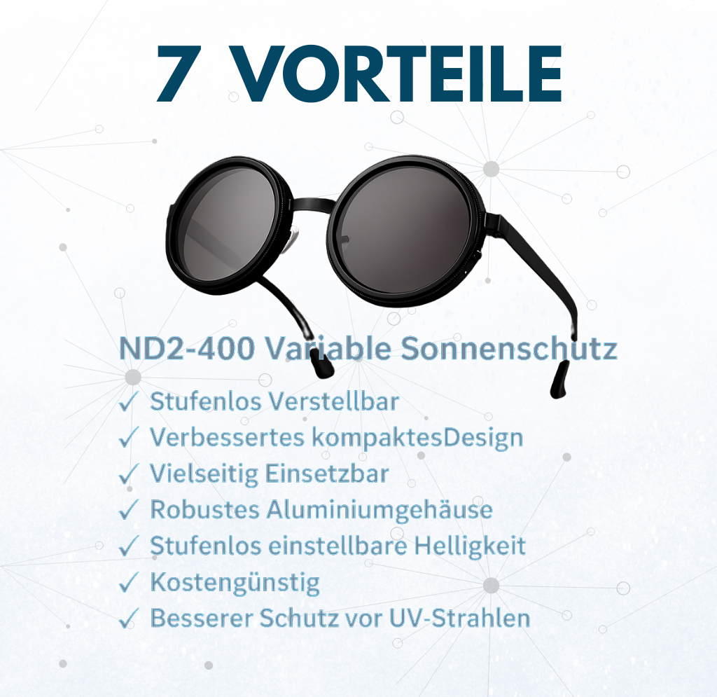 Die ND2-400 Einstellbare Verdunkelungs-Sonnenbrille ist eine High-Tech-Lösung für alle Lichtverhältnisse. Mit stufenlos verstellbaren Linsen passt du die Helligkeit in Sekunden an und genießt dank polarisierter Premium-Gläser eine blendfreie, gestochen scharfe Sicht. Der UV400-Schutz mit Blaulichtfilter bewahrt deine Augen vor schädlicher Strahlung und Ermüdung, während der robuste Metallrahmen in Handarbeit für Langlebigkeit und Eleganz sorgt. Ob beim Autofahren, Angeln, Skifahren, Wandern oder in der Stadt – diese Brille ist dein perfekter Begleiter für jede Situation.