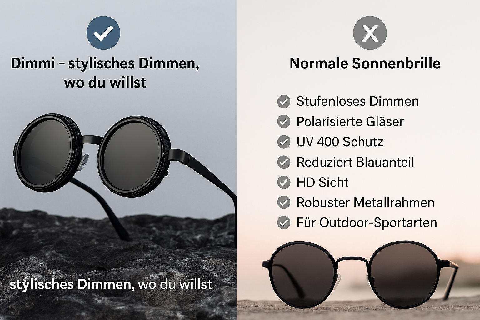 Genau hier setzt Dimmi – die verstellbare Fashion-Sonnenbrille an. Mit ihrem stufenlos regulierbaren ND2–ND400 Filter passt sie sich jeder Situation an. Ob gleißende Mittagssonne, wechselndes Licht beim Autofahren oder entspannter Spaziergang im Park – du bestimmst selbst, wie viel Licht deine Augen erreichen darf.